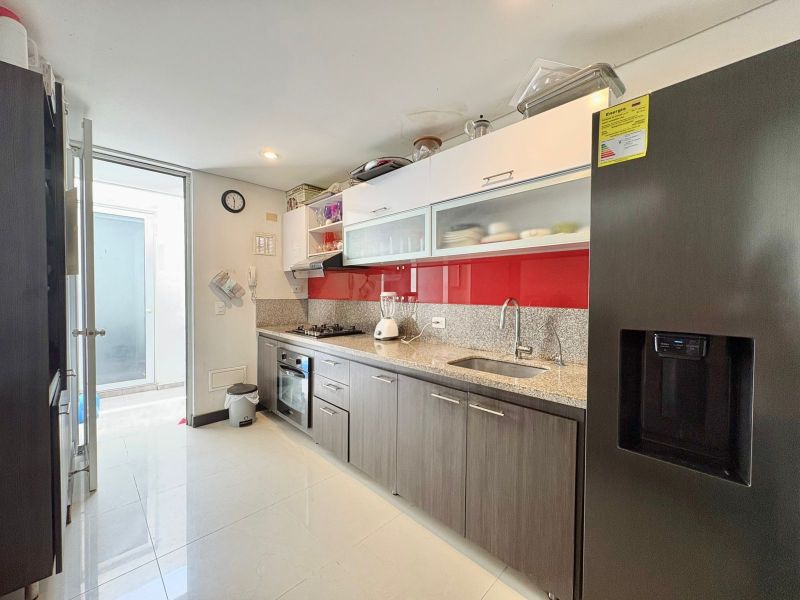 La cocina es cerrada, compacta, no le sobra nada y conecta también convenientemente con la terraza.