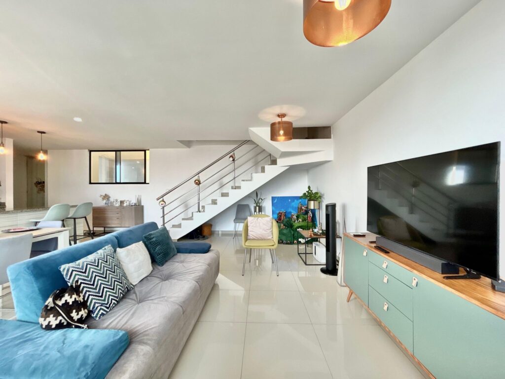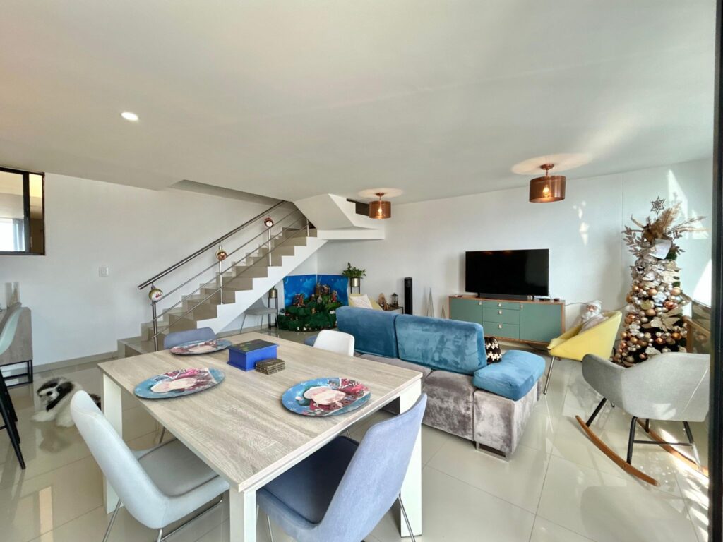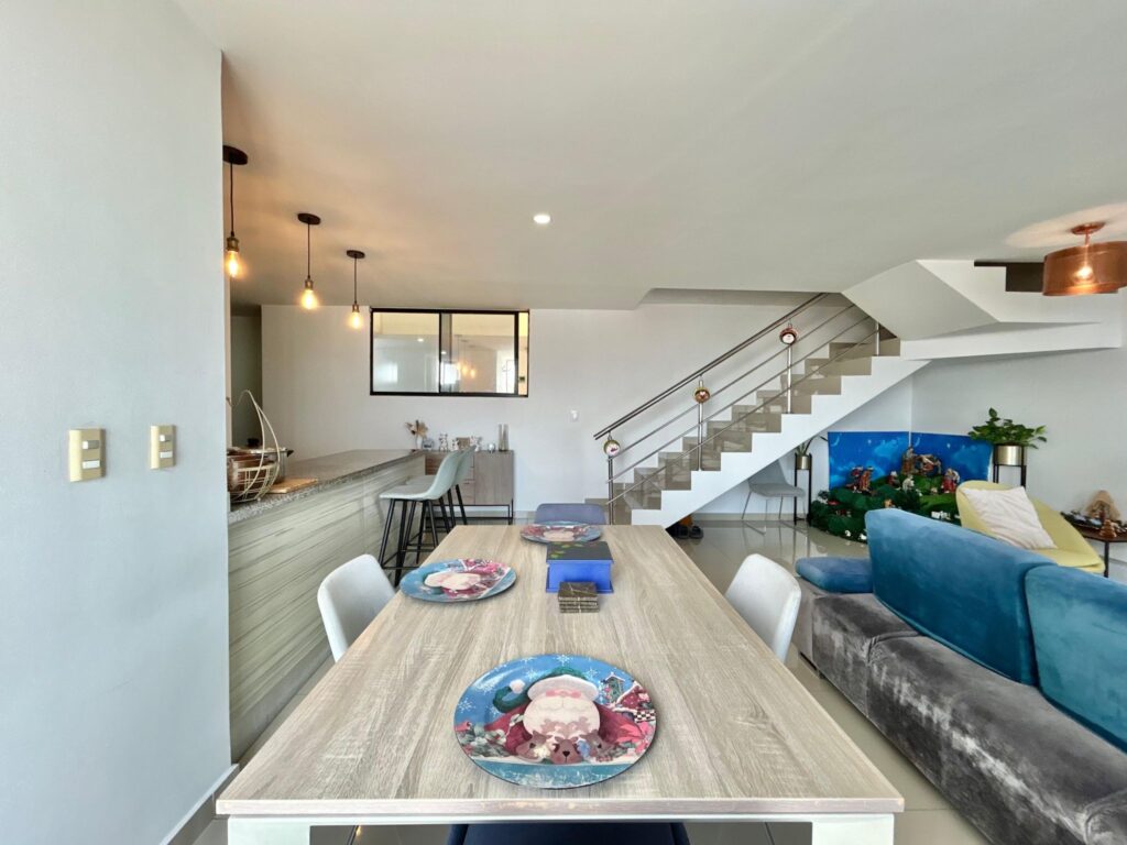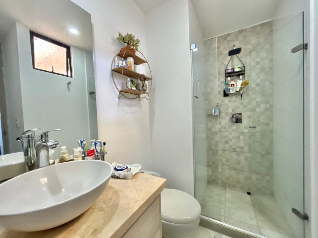 Este apartamento, (actualmente arrendado), ofrece una atmósfera clara y acogedora, con espacios que se conectan de manera natural. En el primer nivel, los pisos en porcelanato beige aportan calidez a un ambiente contemporáneo. El recibo da paso a un baño social, una cocina abierta integrada al área social y un amplio espacio de sala–comedor, bien iluminado y con salida a un balcón que suma aire y luz.