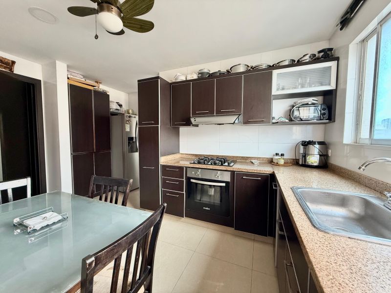 El área social se complementa con estudio, baño auxiliar, cocina, zona de lavandería y alcoba con baño de servicio.