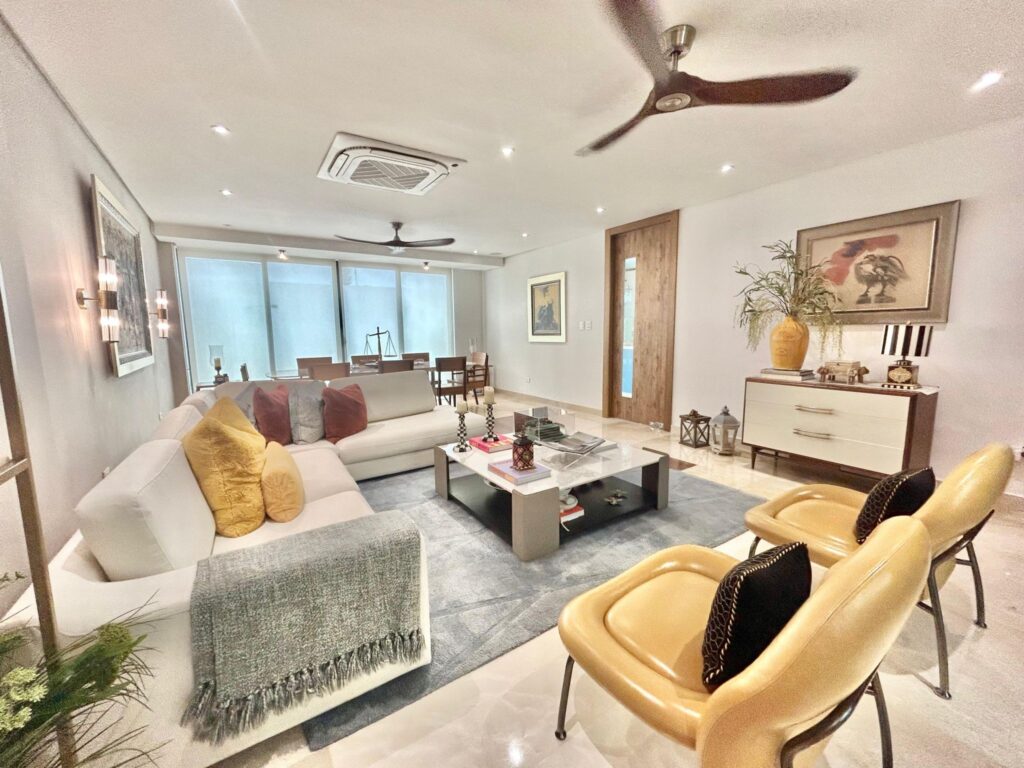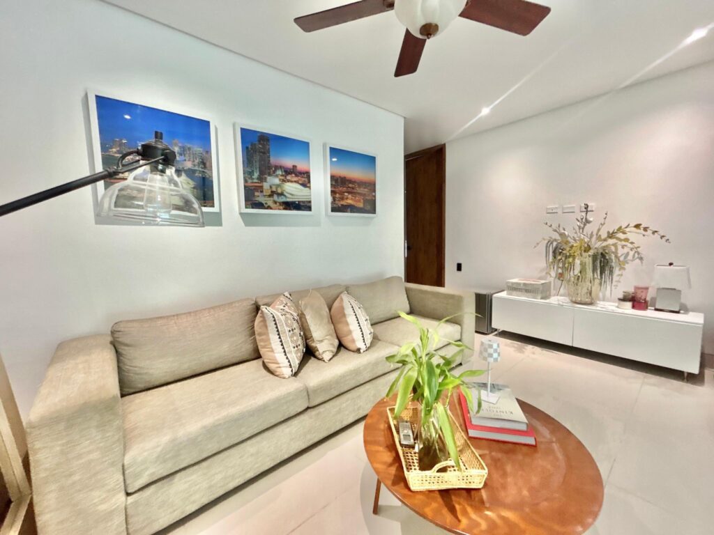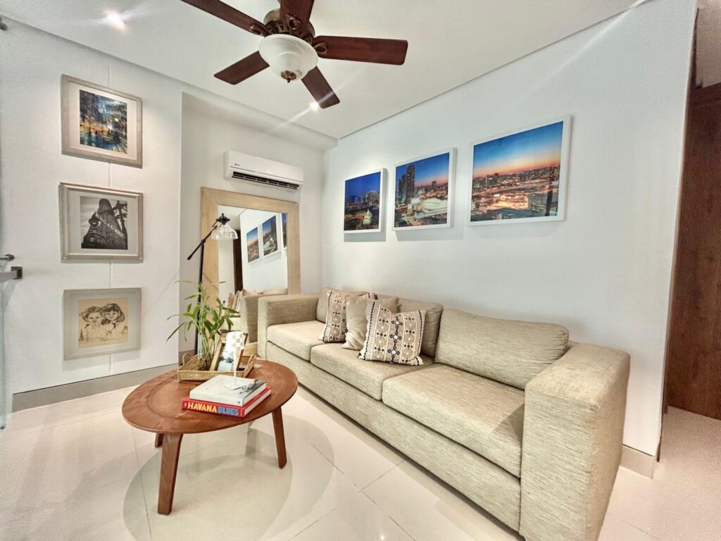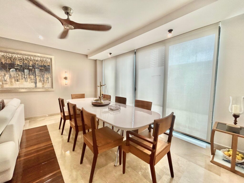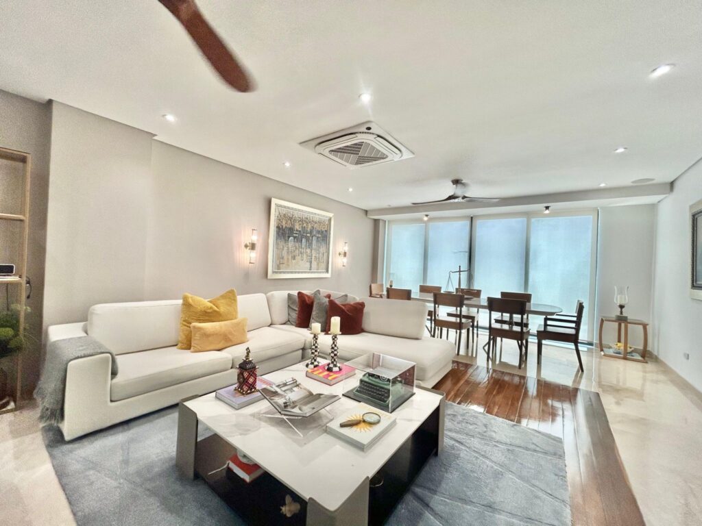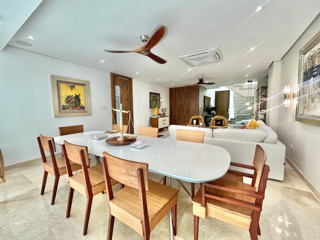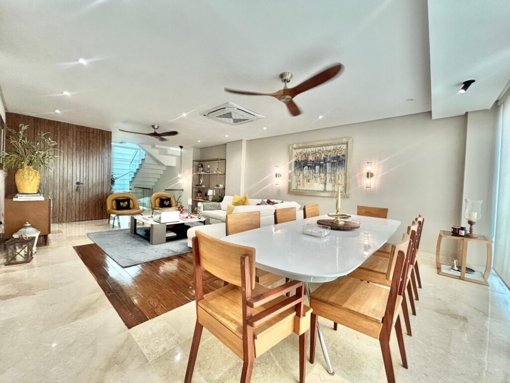 El ingreso, con doble altura, abre la escena: mármol bajo los pies, sala y comedor que dialogan con la luz, acompañados por un aire tipo casette y cortinas que ya se quedan como parte del ambiente.