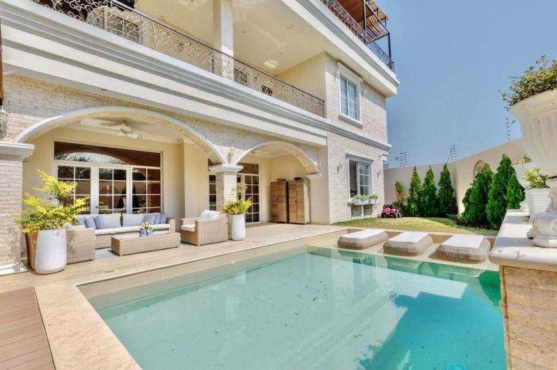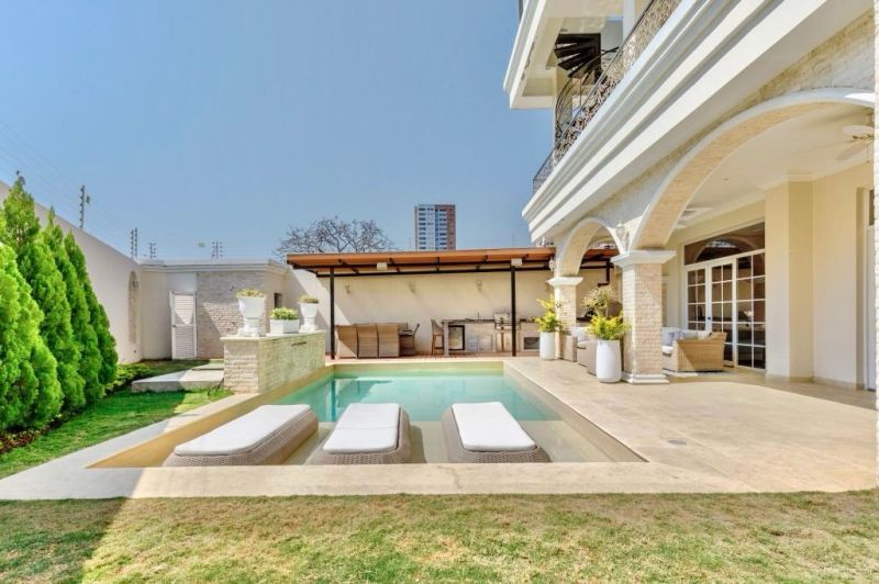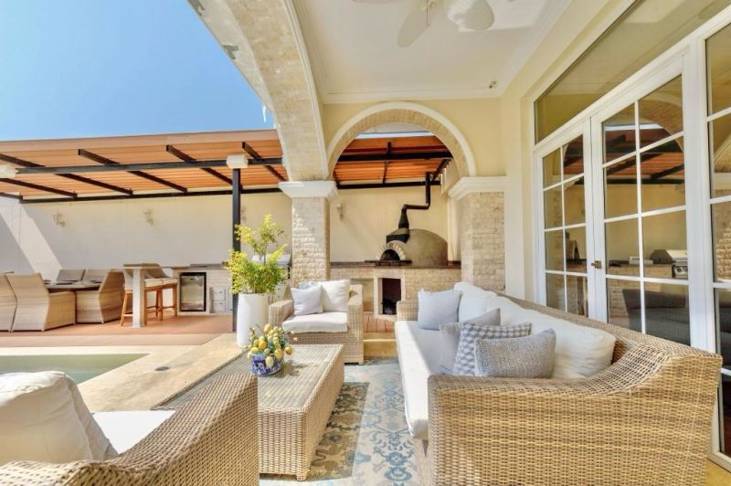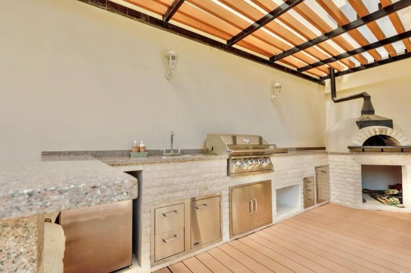 El patio se convierte en un refugio de entretenimiento: terraza junto a la piscina, sala y comedor exterior, zona BBQ y un horno para pizza que invita a compartir.